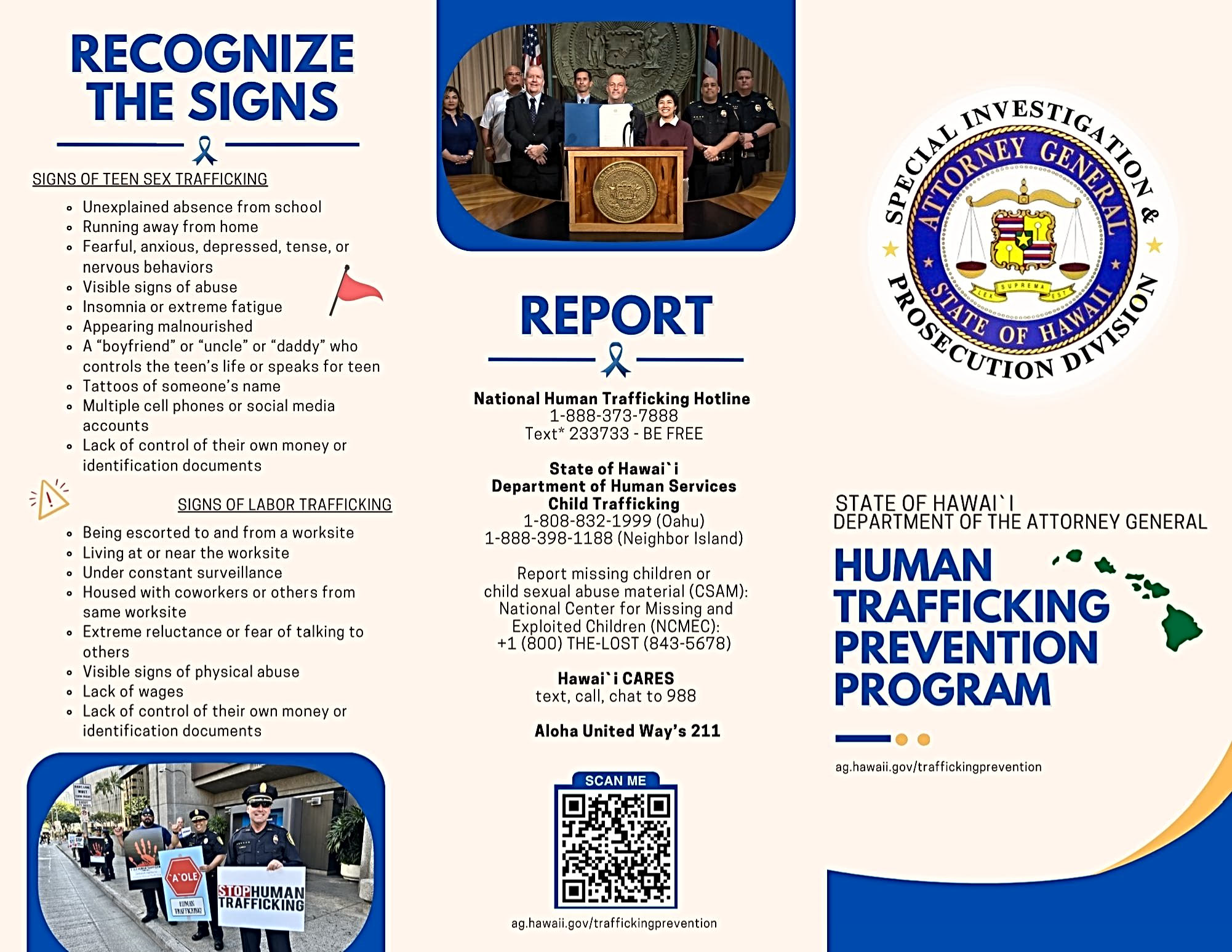 If your organization or civic group would like more information about human trafficking, please contact our office by email at [email protected] or by phone at 808-460-5347.