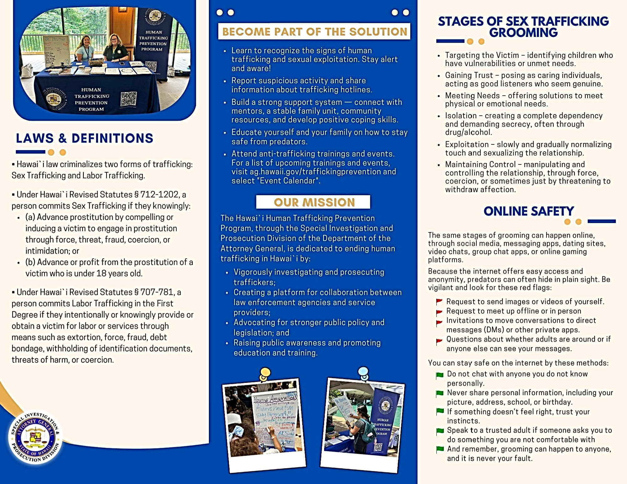 The Hawai‘i Human Trafficking Prevention Program is dedicated to addressing the needs of human trafficking victims through the development and implementation of comprehensive statewide strategies. These strategies focus on preventing trafficking, assisting victims, raising public awareness, and providing specialized training to empower communities and stakeholders in combating this critical issue.
